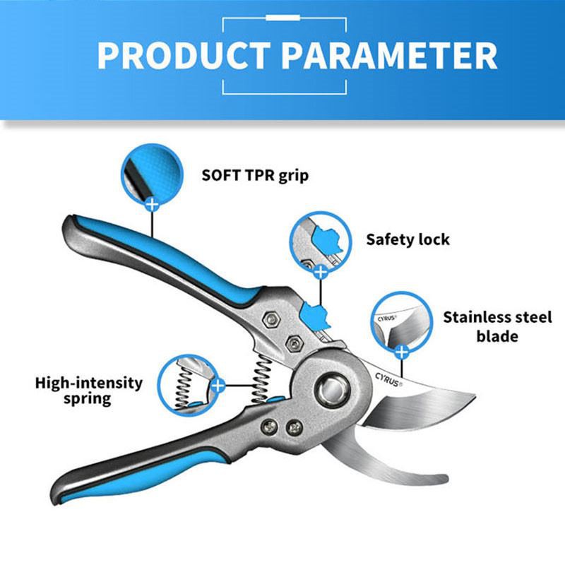 Pruners din oțel inoxidabil este designul nostru independent de Pruner de ultimă generație, utilizarea unei lame din oțel inoxidabil de ultimă generație și cu radian de tăiere cu precizie a mușcăturii, cu mâner din aluminiu turnat ușor ca mâner principal și adeziv moale TPR înfășurat în contact cu mâna. loc.